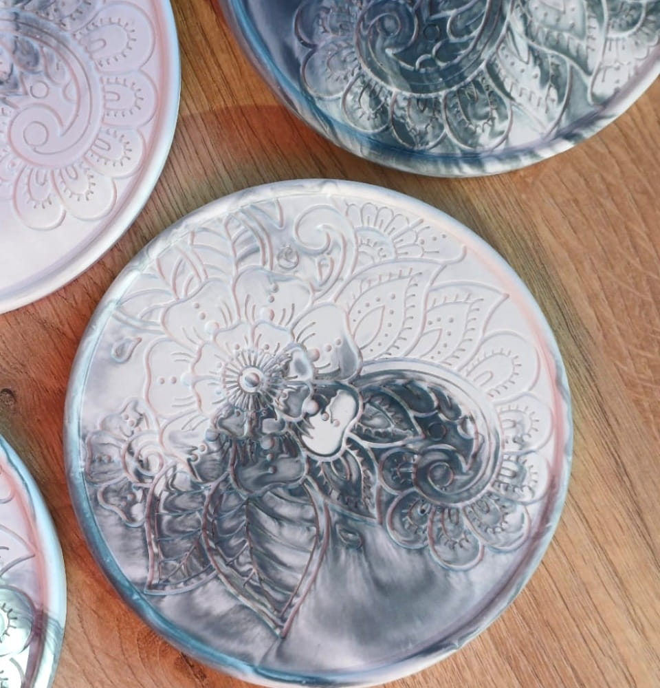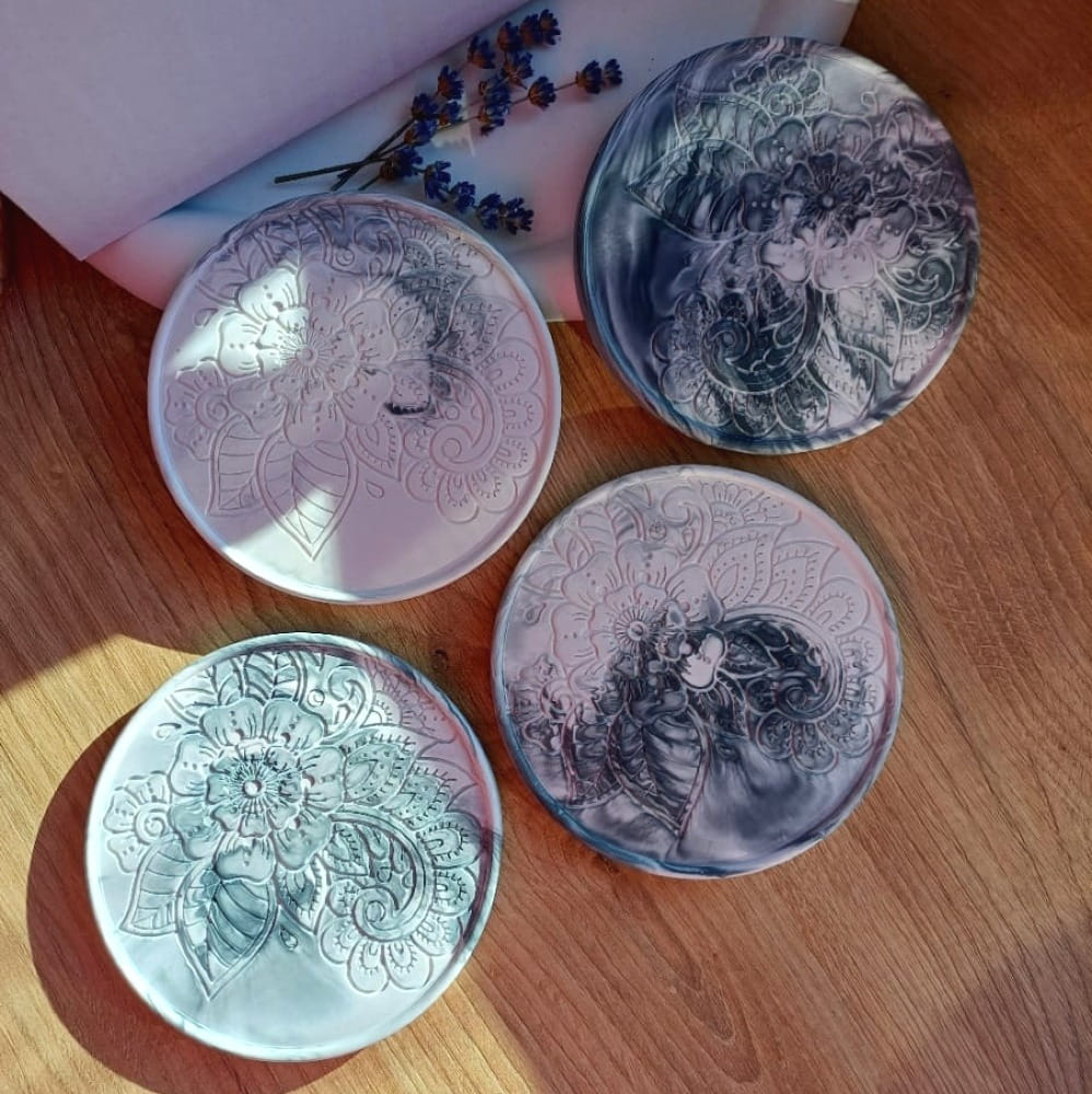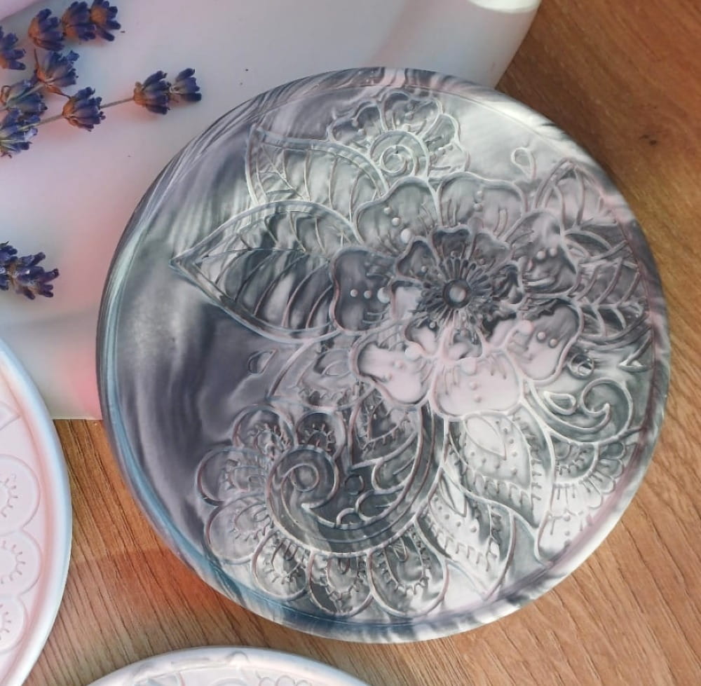 Unikatowa podstawka z gipsu polimerowego okrągła z wzorem kwiatowym.