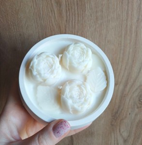 - Unikatowe zdobienie: Powierzchnia świecy ozdobiona jest białymi piwoniami, które pięknie prezentują się w gipsowym naczyniu.